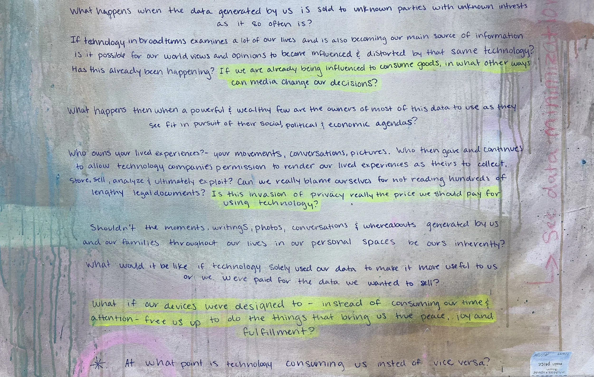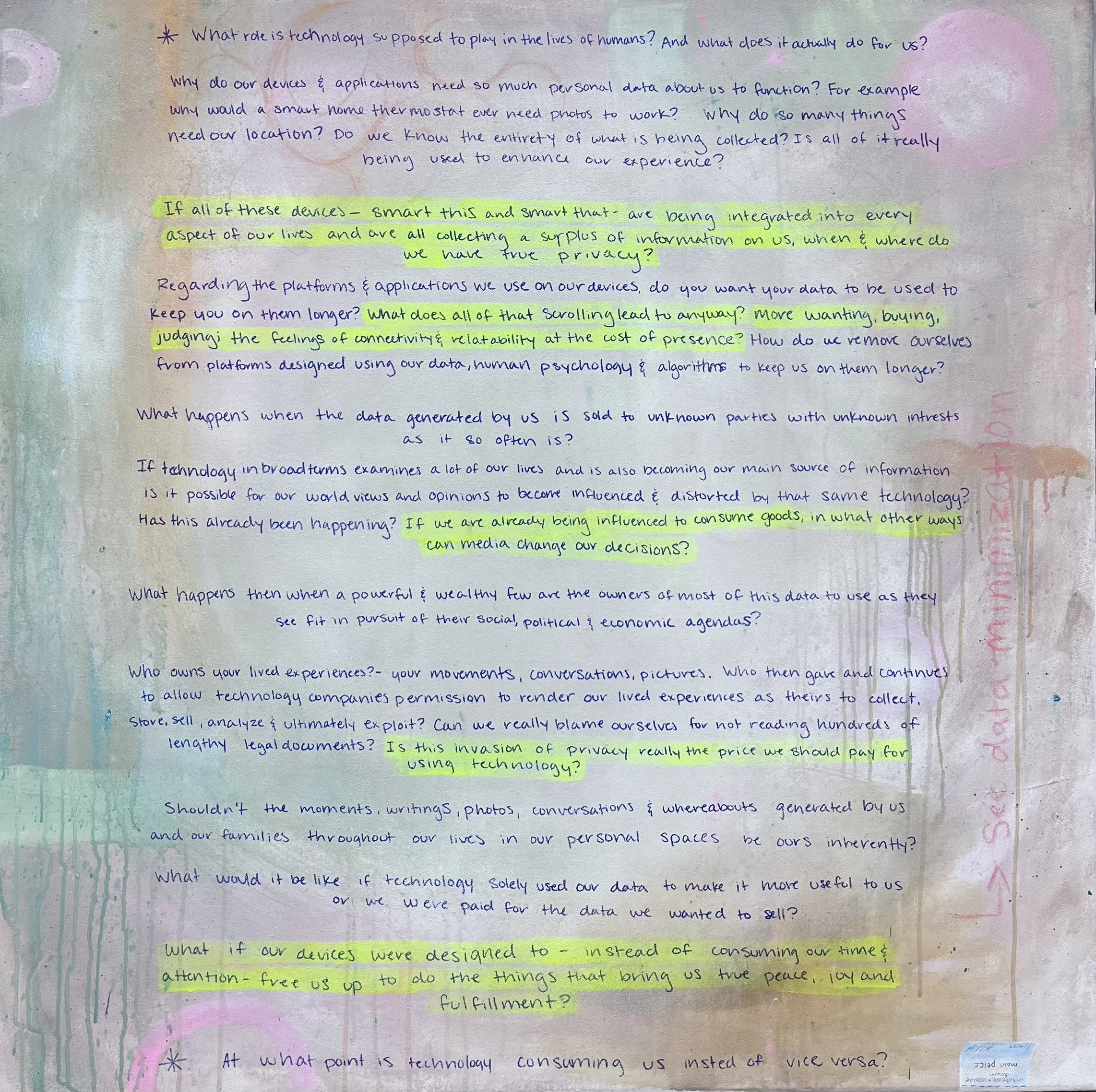 This series is about surveillance capitalism and all it entails, including the cycle of overworking and overconsuming, the overcollection of our data, and the robbery of one of our most precious resources - time. I hope these works invoke reflections on what brings us true peace and fulfillment, and evaluations of how we lead our lives in accordance with that.