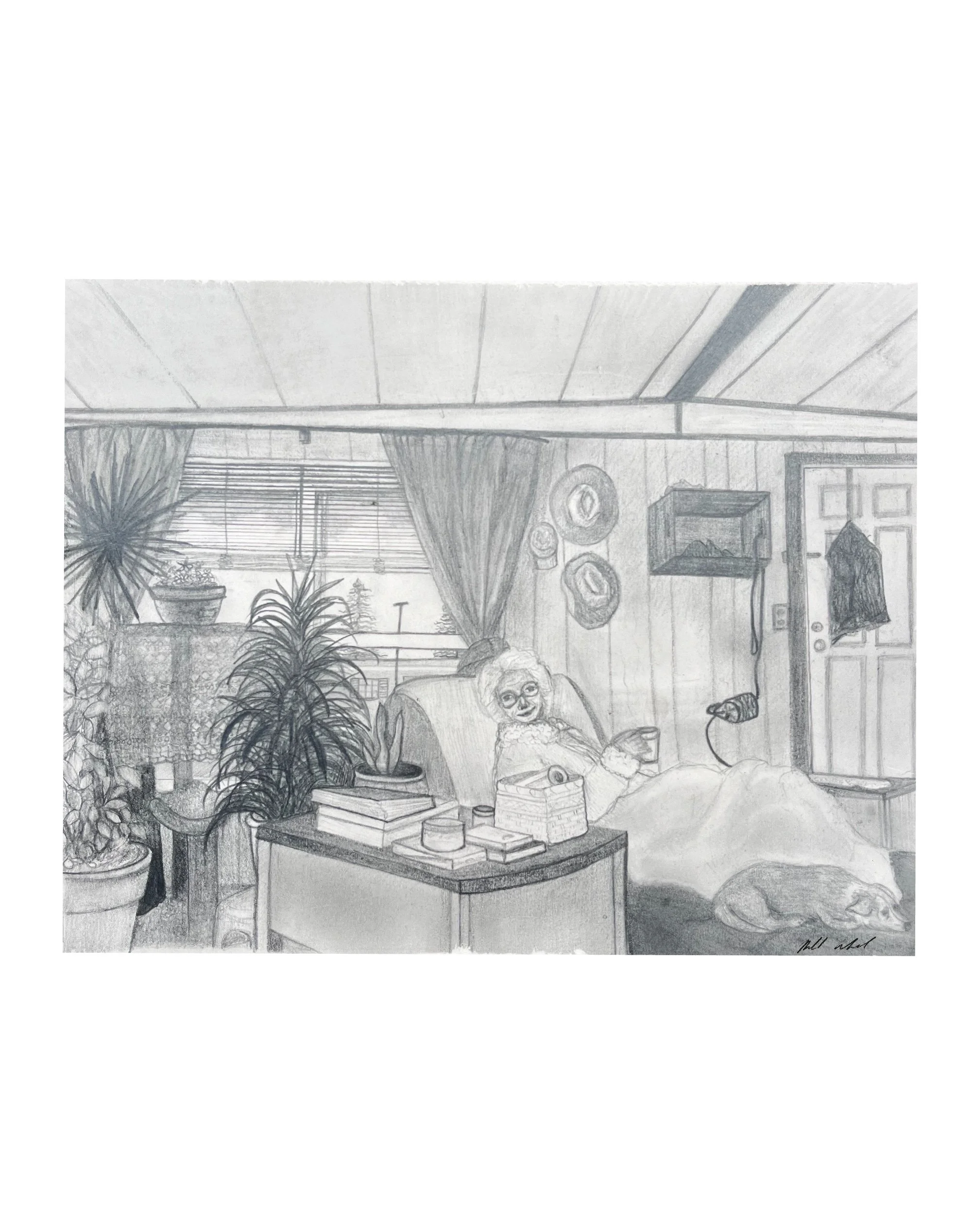 "lazy day" pencil drawing on graph paper 8"x10" created in 2024